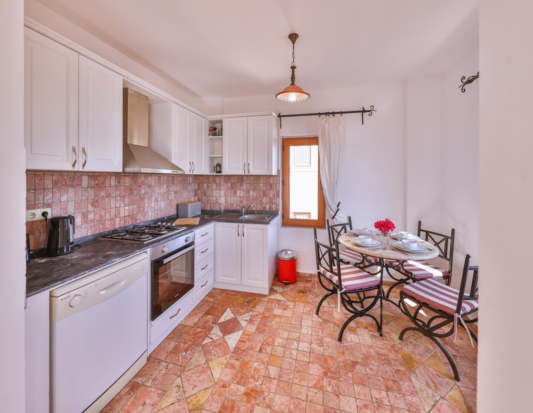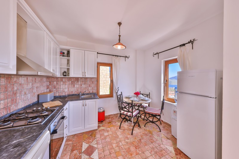 The well-equipped kitchen has a fridge freezer, water cooler, gas hob with extractor fan, electric oven, dishwasher, washing machine, toaster and kettle. Within the kitchen is a round dining table with 4 chairs and windows looking out over Kalkan towards the sea.