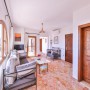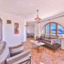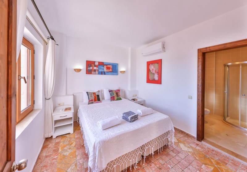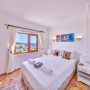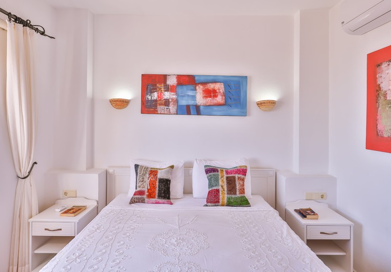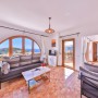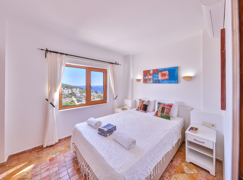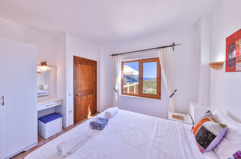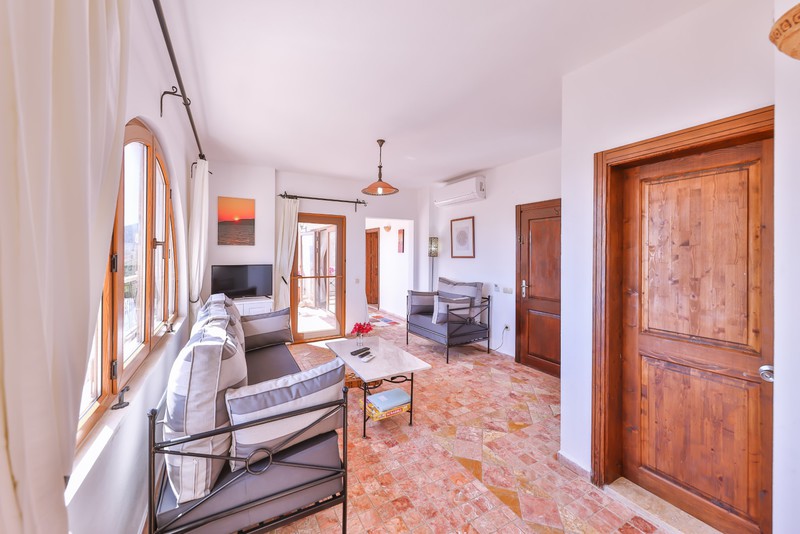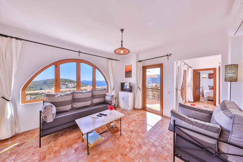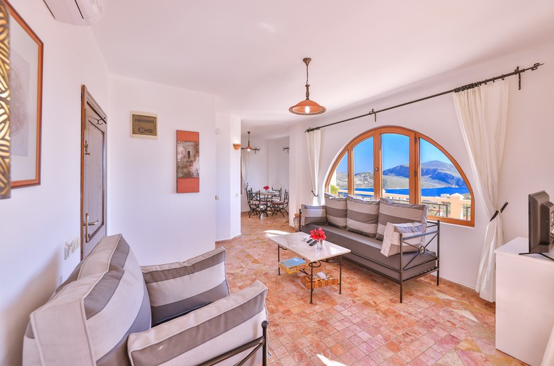 Through the entrance door is the sitting room with a sofa under a wonderful half-moon window offering views across Kalkan and Kalamar Bays. There is also a coffee table and armchair as well as a small flat screen TV. A glass door gives access to the balcony.