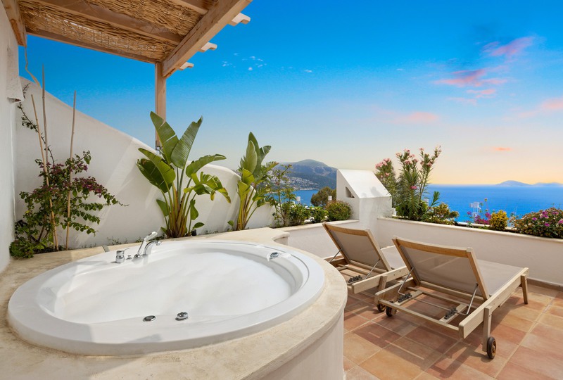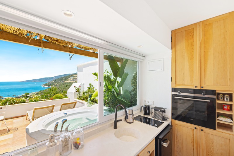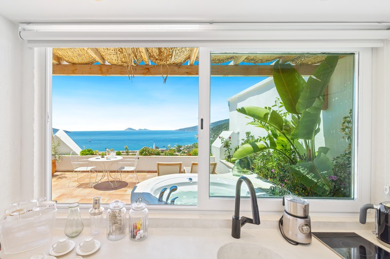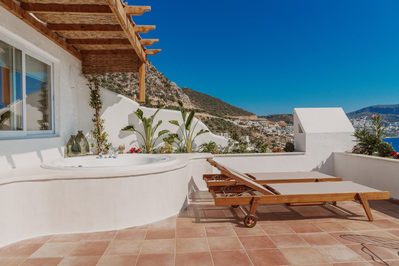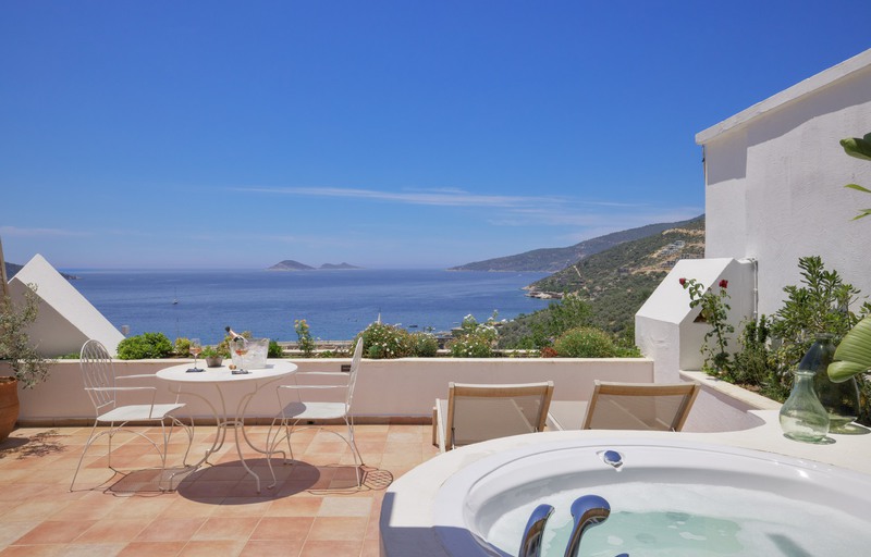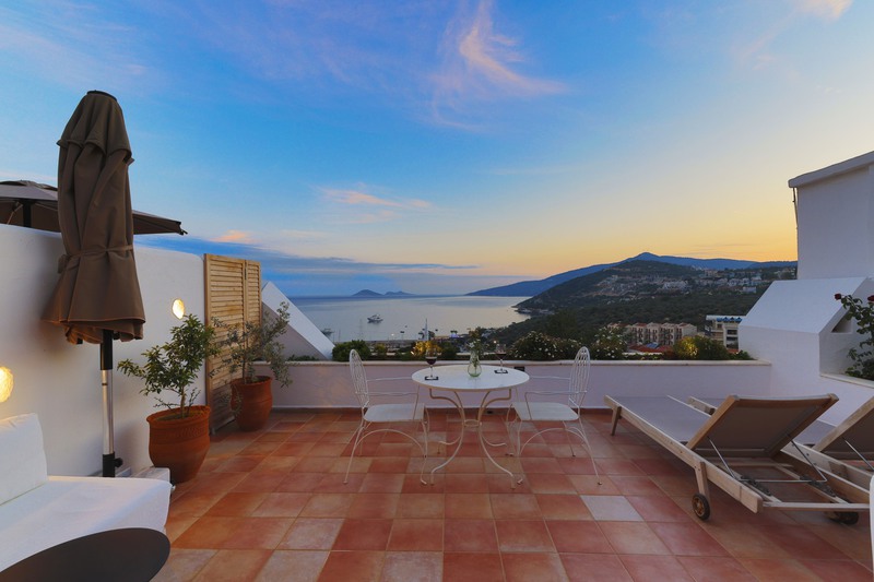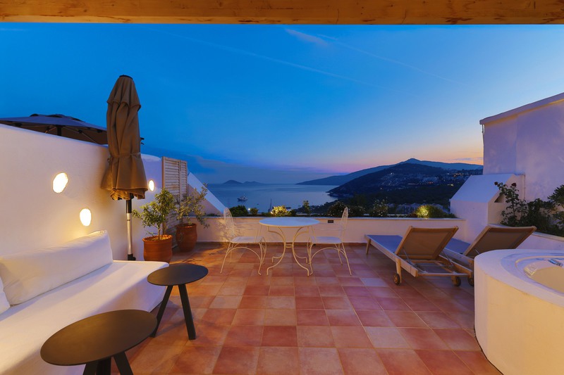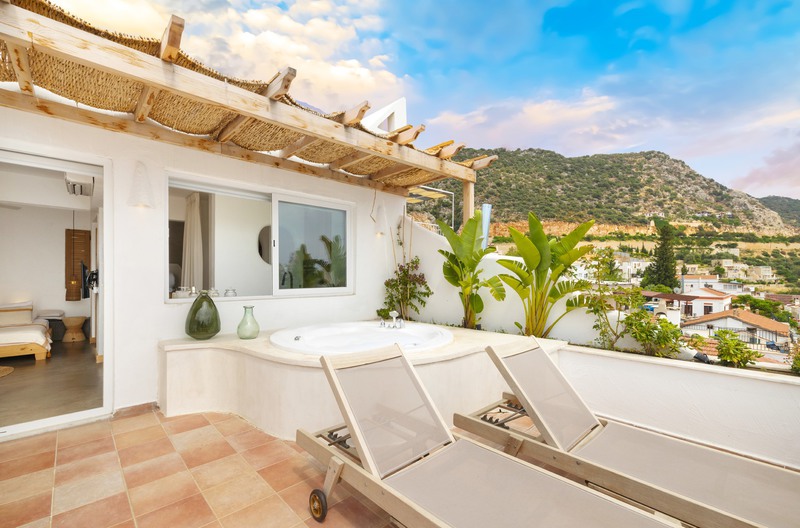 The two beautifully designed Suites at the Kalkan Han Hotel offer stylish and comfortable accommodation, with wonderful views, Smart TV, air-conditioning, kitchen, safe, and Jacuzzi bath on the large roof terrace – the perfect place to watch the sun go down over the Mediterranean Sea.