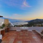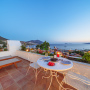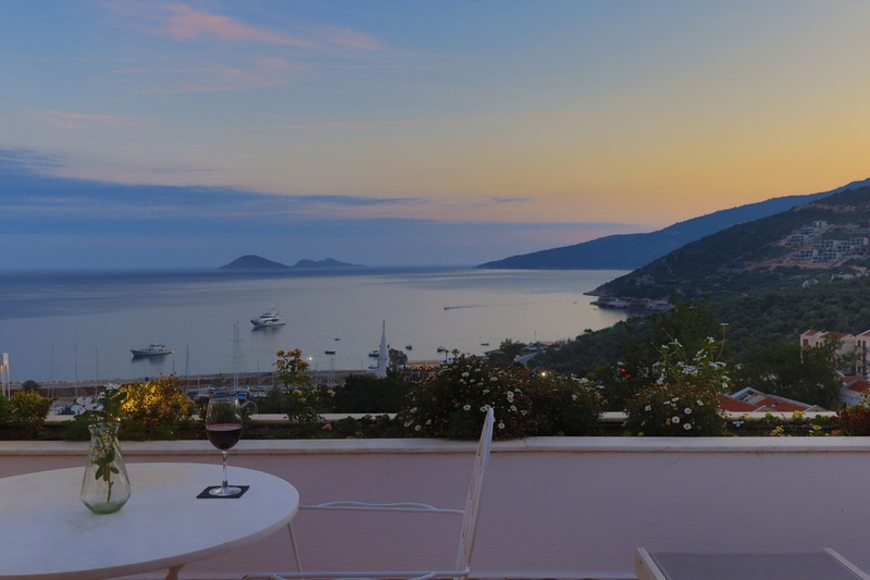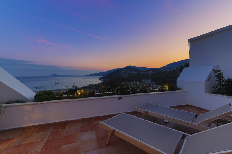 Views are across the roof tops to Kalkan Bay, the islands beyond and the mountains.