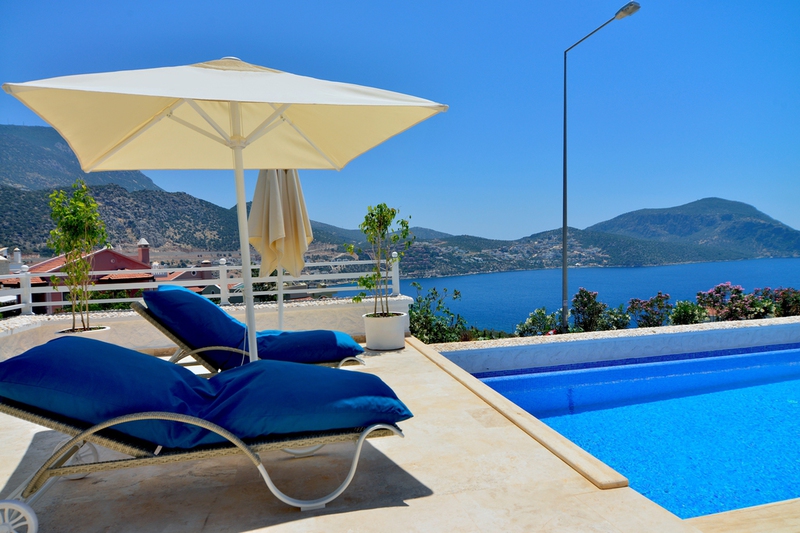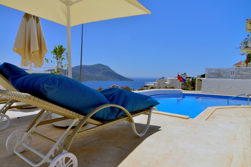 A large double room with ensuite, at pool level. There is a private terrace with table and chairs, which leads directly on to the pool side terrace and main pool. This room has full sea views over Kalkan bay. This room can also be made into a twin bedded room if required.