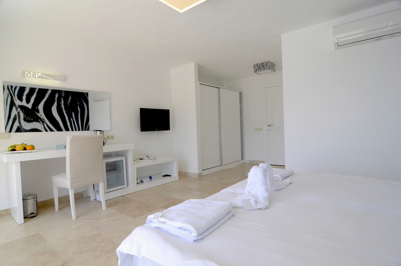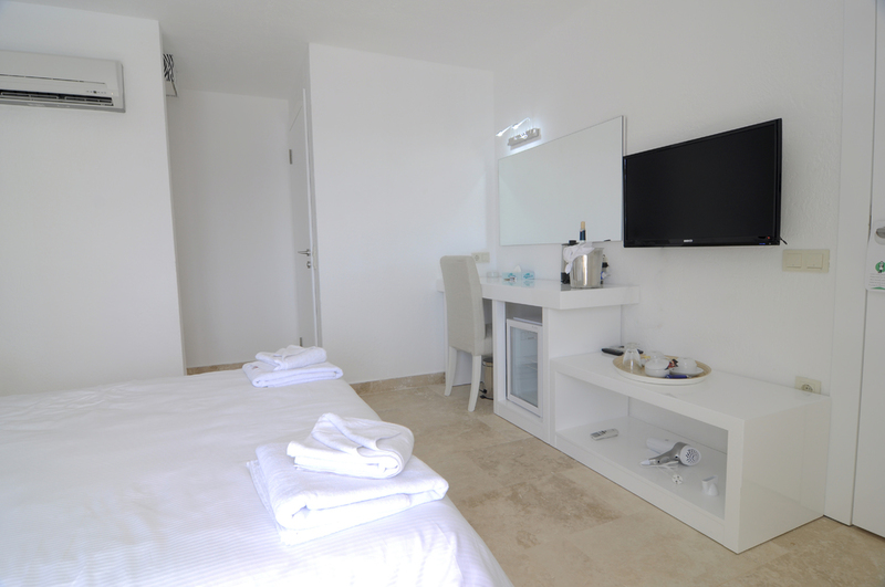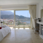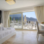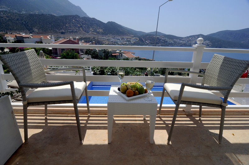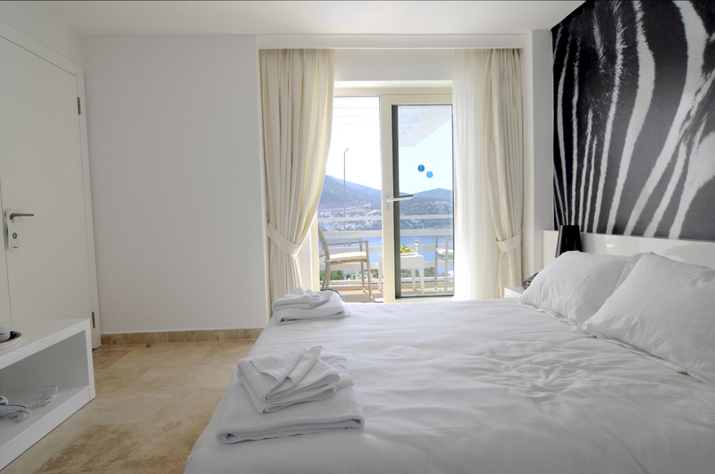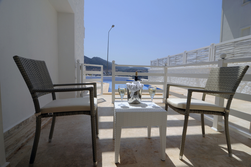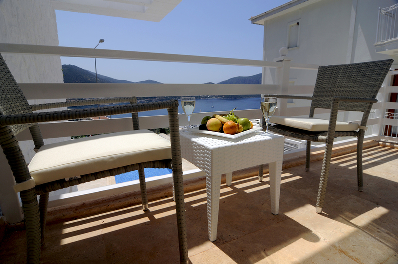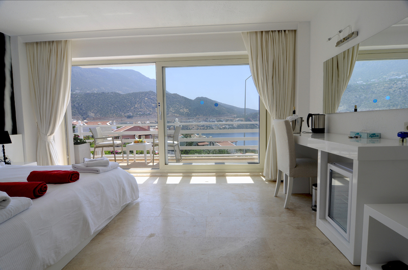 A spacious double room with ensuite shower, which is located on the first floor of the hotel. There is a private balcony with table and chairs, from which guests can enjoy the full sea views of Kalkan Bay.