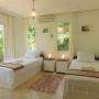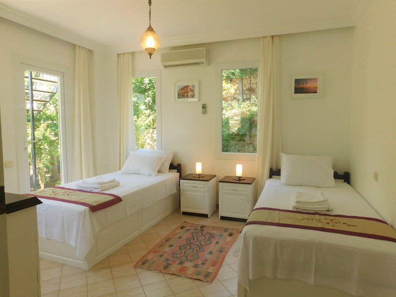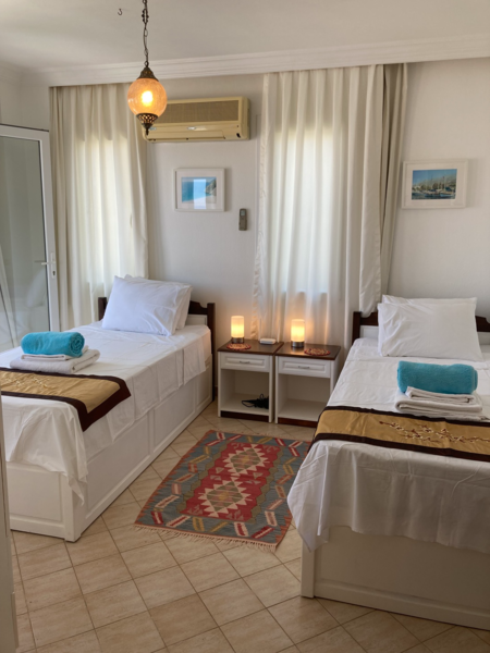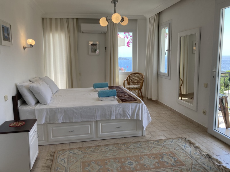 The second floor comprises a large, double bedroom again with a super-king sized bed, dressing room, shower room and two balconies overlooking Kalkan Bay and the fourth bedroom, with twin beds, en-suite shower room and balcony overlooking the garden, pool and the sea.
