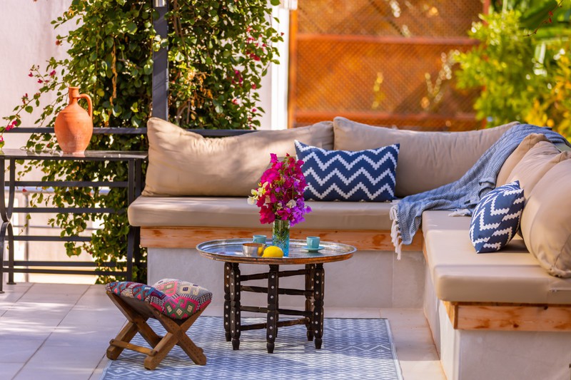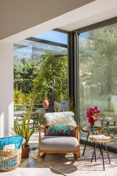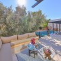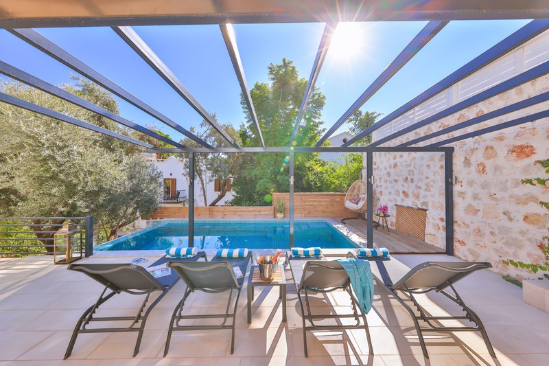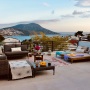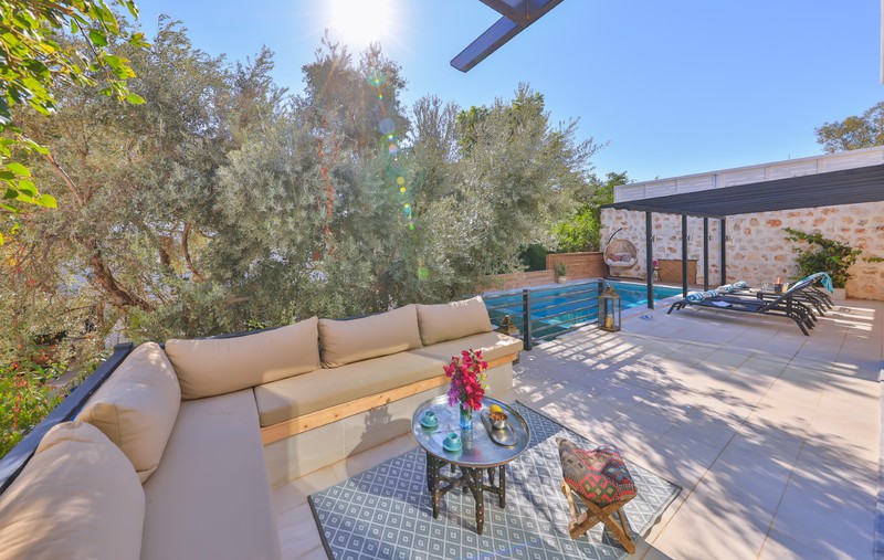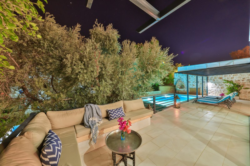 The L-shaped seating area by the pool, offers a comfortable place to relax within the well established gardens that surround the villa. There is also an additional raised terrace area with cushioned seating set around a fire pit; ideal for the cooler nights in Kalkan at the beginning and end of season.