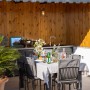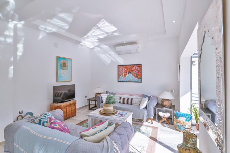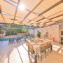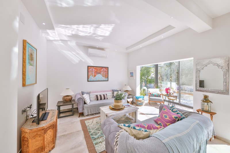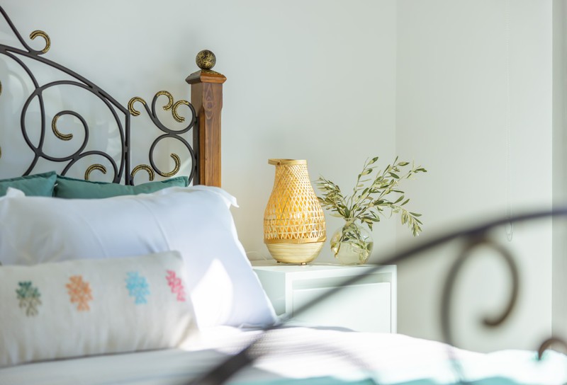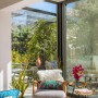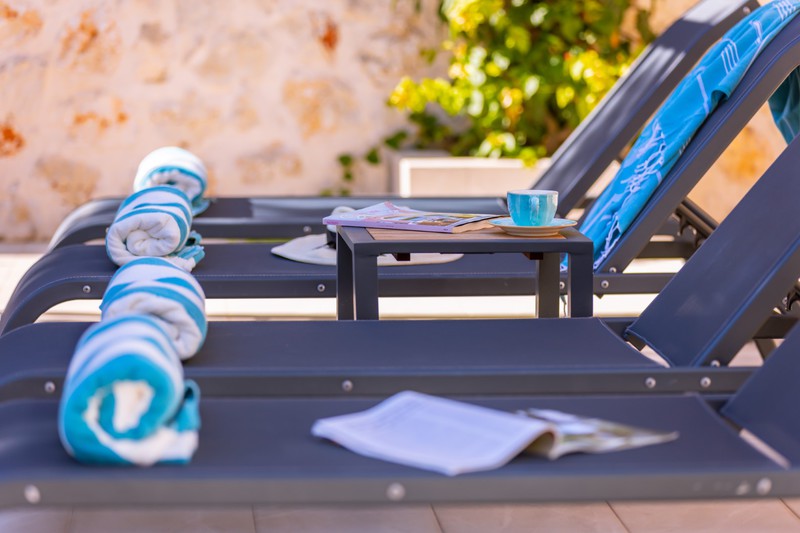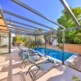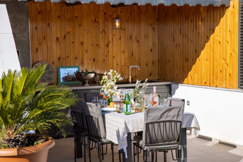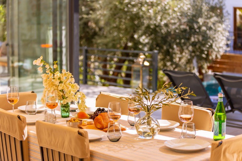 The living area has two comfy sofas with a flat screen TV plus a further armchair and side tables in the conservatory that has sliding doors leading out to the pool terrace. When these are open, the room merges with the outside space where you'll find an L-shaped seating area beneath the olive trees.