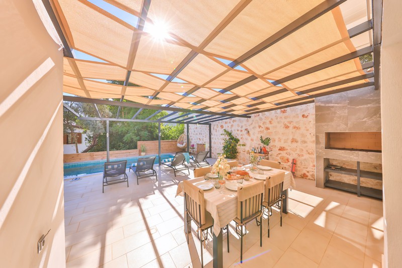 Shore House benefits from having a spacious roof terrace which is equipped with an outdoor kitchenette complete with dishwasher and fridge. There is also a built in BBQ and a dining table that can comfortably seat 8. A large L-shaped sofa is provided from which to enjoy the views across to Kalkan Bay.