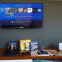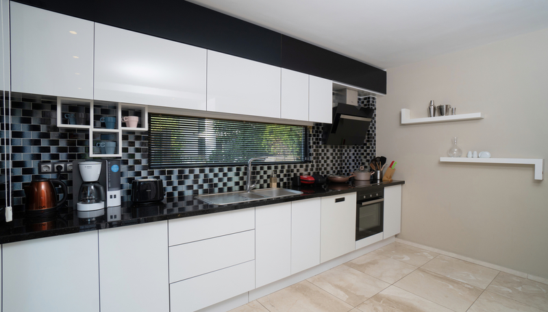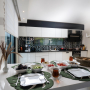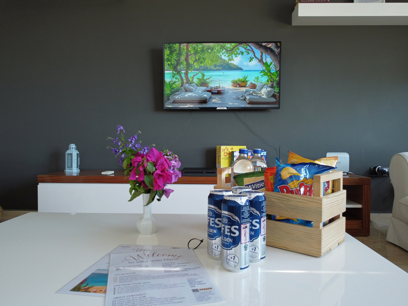 The property is accessed from the street below through a gate that takes you up to the pool terrace. The front door leads into an open plan living space. At the front of the villa is the living room furnished with two sofas and an armchair spaced around a coffee table plus a wall mounted Smart TV. There is also a Play Station for guests’ use. Sliding doors lead to the pool terrace.