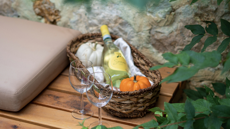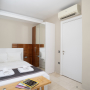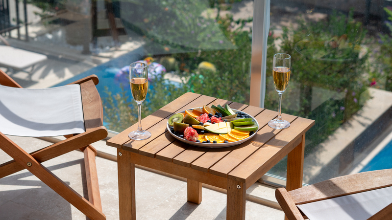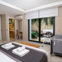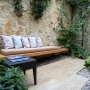 On this level is a double bedroom with en-suite shower room. Within the room is a built-in wardrobe and dressing table. Sliding doors lead to a private courtyard furnished with a wooden bench with cushions.