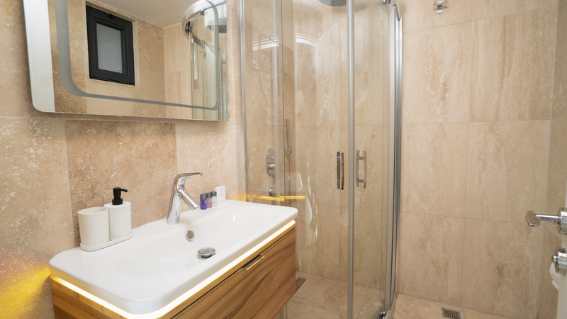 The double bedroom at the front of the villa has an en-suite shower room which is accessed through opaque glass doors. Within the room is a wardrobe, dressing table with drawers, together with