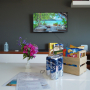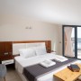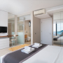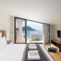 a wall mounted Smart TV. Sliding doors lead to a private sea view balcony that’s furnished with two lounger chairs and a small table from which to enjoy the views.
