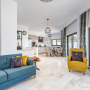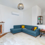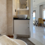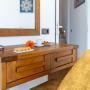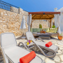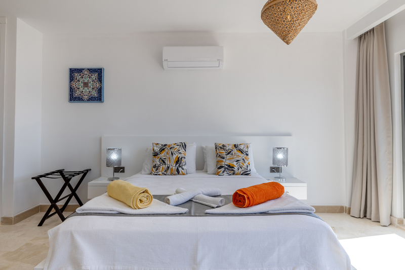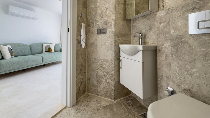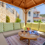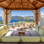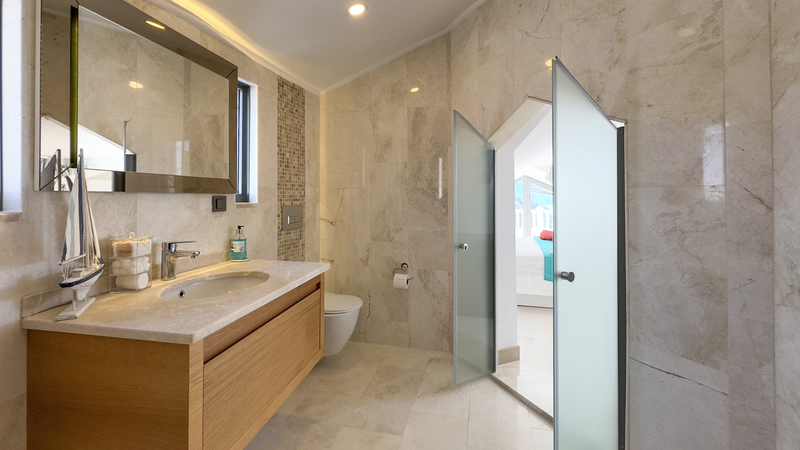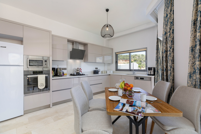The living area is accessed through the entrance hall. There is a cloak room with WC and hand basin as well as a small shower for guests’ use and then a couple of steps lead down to the living area. To the right is a large L-shaped sofa and an armchair spaced around a coffee table with a smart TV and a decorative built in fireplace. Sliding doors lead to the upper terrace with a kosk and a BBQ for guests to enjoy the wonderful sea views.