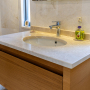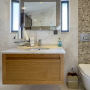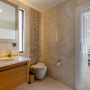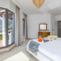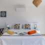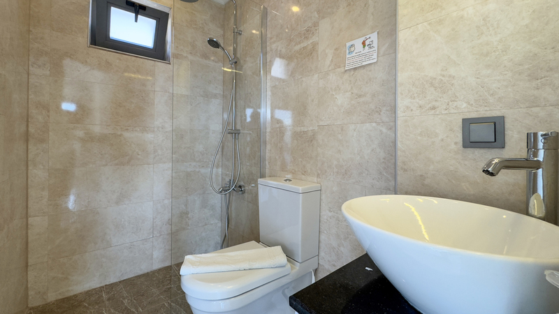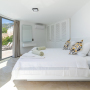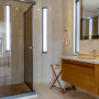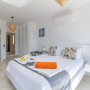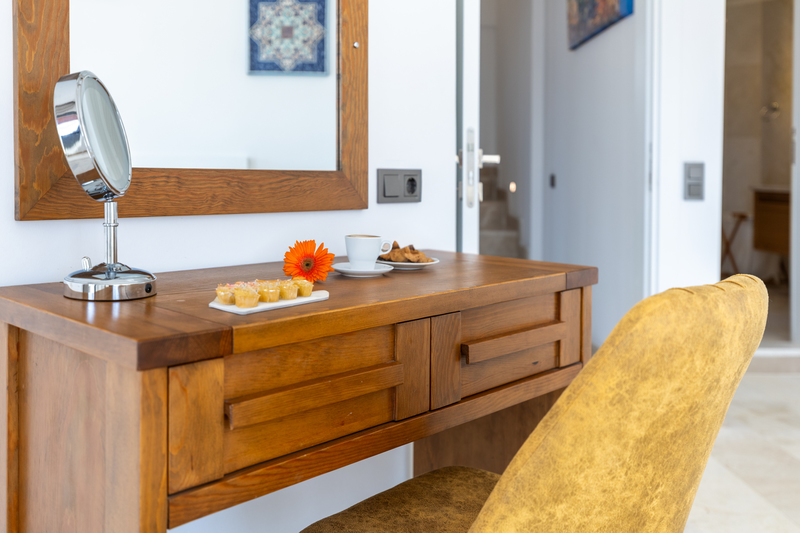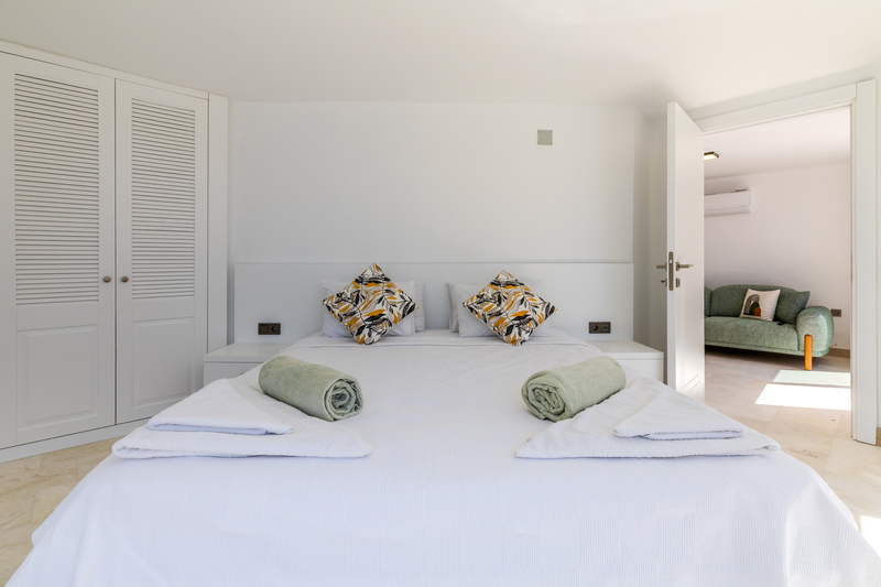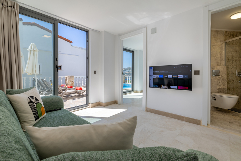 The fourth bedroom is accessed through sliding glass doors by the pool with a small sitting room with a sofa and wall mounted smart TV. There is also a shower room with WC and basin. The double bedroom has a built-in wardrobe and dressing table with chair. We would recommend this room is not used by young children as it is separately accessed from the main villa and beside the pool.