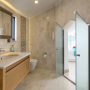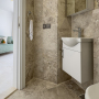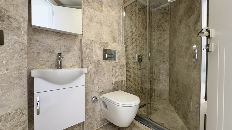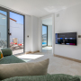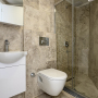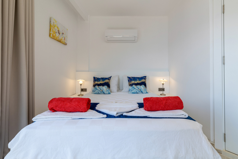 The second bedroom on this level is the master bedroom with en-suite shower room. Within the room is a built-in wardrobe and a dressing table with a chair. A glass door leads out to the shared balcony and to the side of the room is also a Juliette balcony with spectacular sea views.