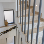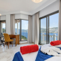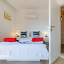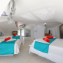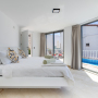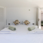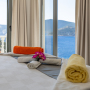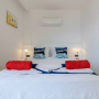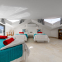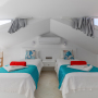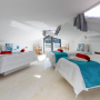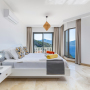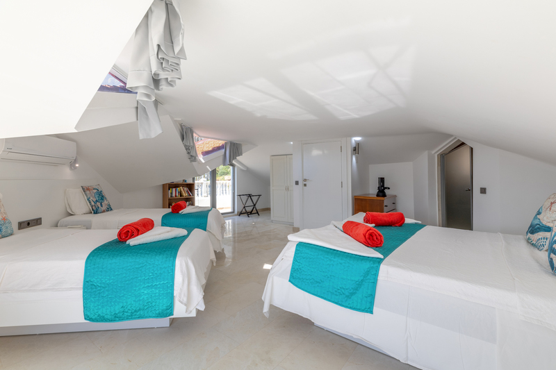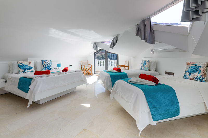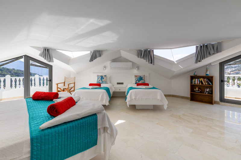 This floor is the family room under the eaves with an ensuite shower room. There is a double bed with built-in headboard and bedside tables as well as two single beds with a built-in headboard and a bedside table between them. Within the room is also a built-in wardrobe and a cabinet with shelves offering more storage. On either side of the room are sliding doors to access the two balconies with stunning sea views.