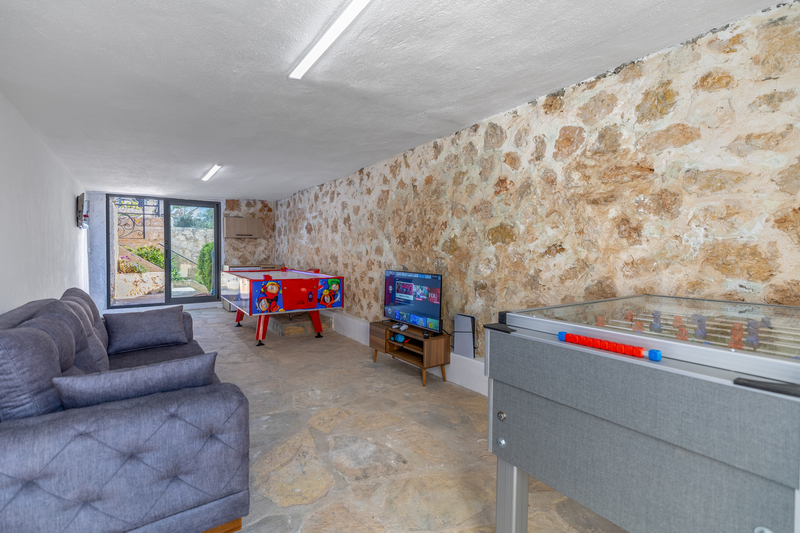 The separate games room is behind the villa by the steps that go down to the front door. Through sliding doors is an air hockey table, table football and a wall mounted darts board. There is also a sofa with a large smart TV to enjoy watching films and a minibar with a fridge and sink with glass ware.