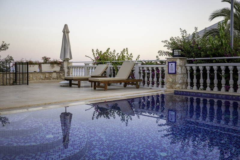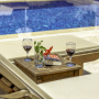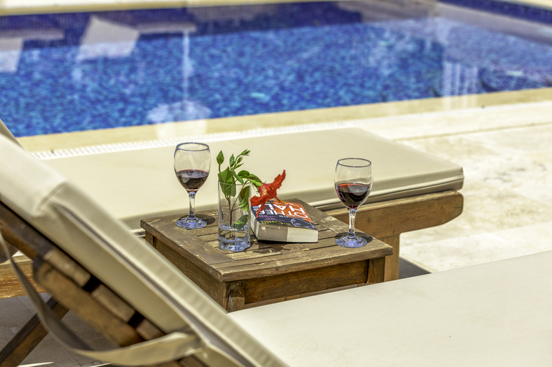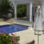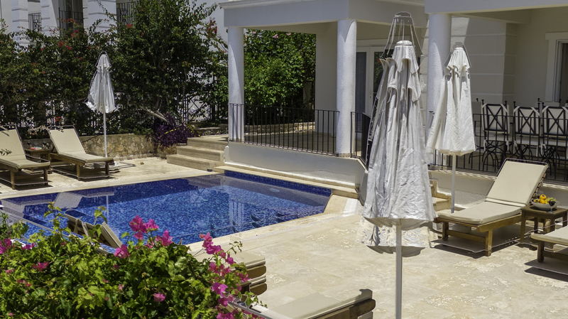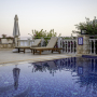 The pool terrace has a freshwater pool with Roman-style steps for access to the water. Spaced around the pool are 8 sun loungers with 4 parasols.