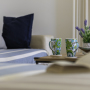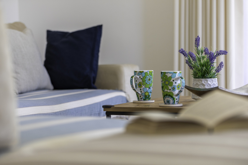 The living room door opens into a light and airy space, with an L-shaped sofa, an ottoman and coffee table. The wall mounted smart TV gives you access to Netflix as well as other viewing options.