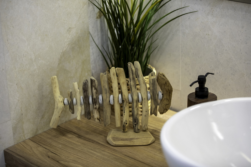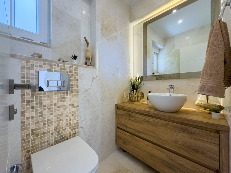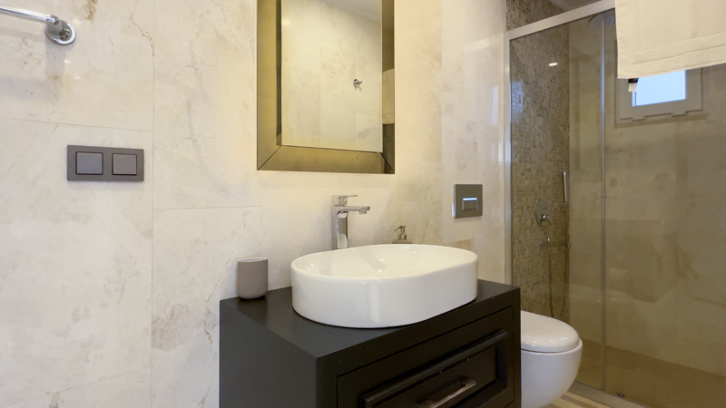 The entrance door to the side of the villa opens into a hallway with a circular staircase and a cloakroom with WC and basin for guests’ use.