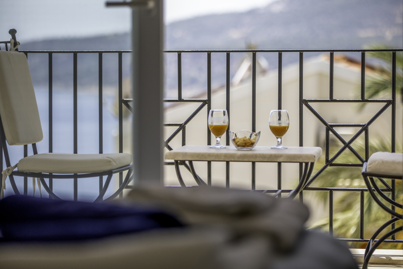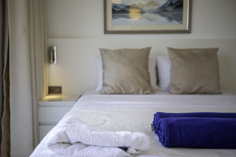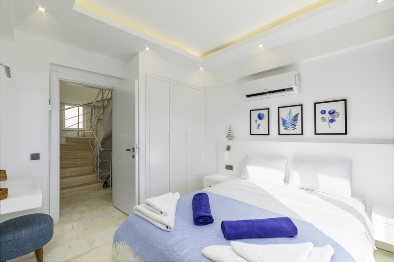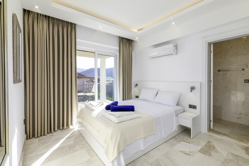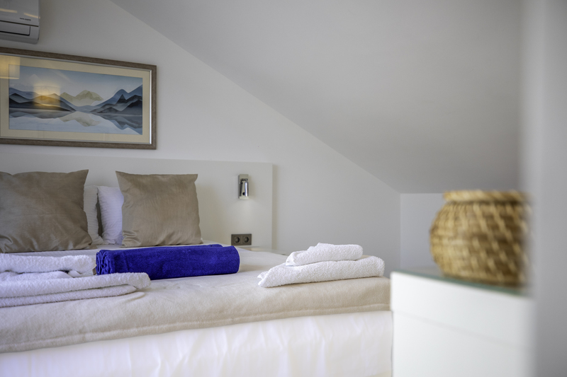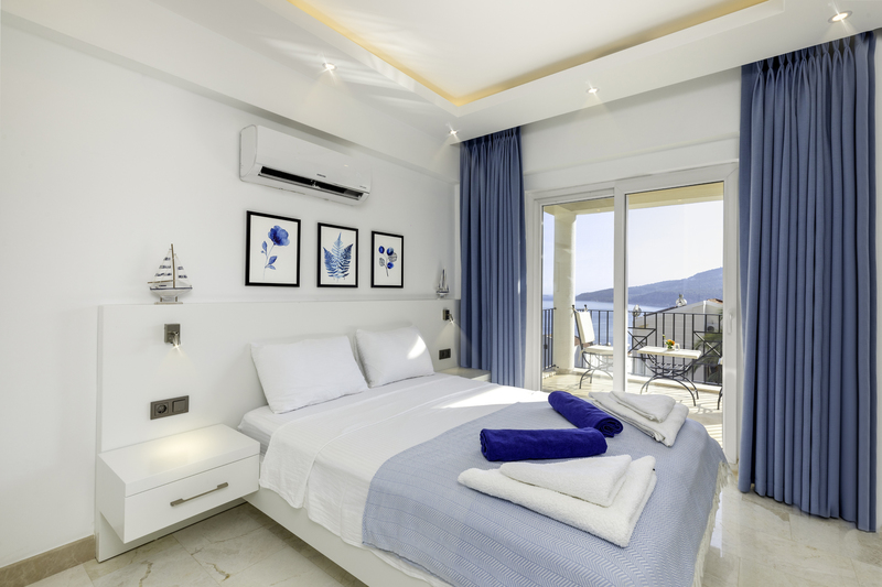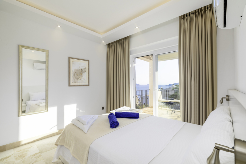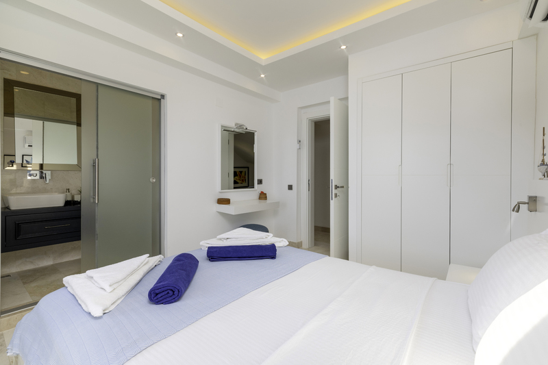 There are three bedrooms on this floor – at the top of the stairs is the first double bedroom with an en-suite shower room. Within the room is a wardrobe and dressing table with stool. Sliding doors lead out to a private covered balcony with two chairs and a side table from which to enjoy the sea views across Kalamar Bay.