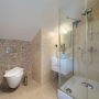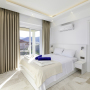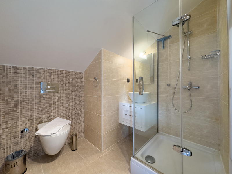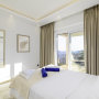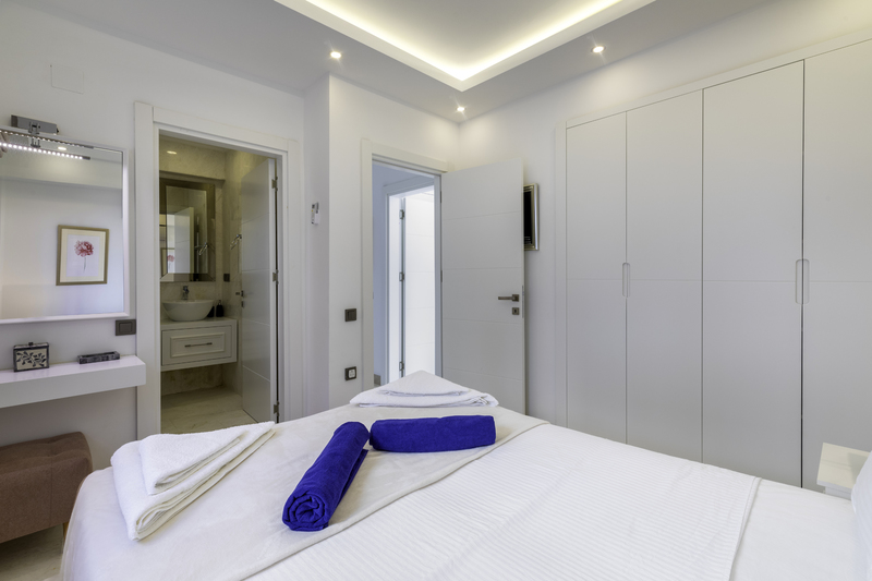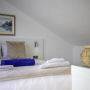 There is also a double bedroom on this level with an en-suite shower room. Within the room is a dressing table with stool and the wardrobe is on the landing for guests using this bedroom. Glass doors lead to the roof terrace offering panoramic views of the bay and mountains.
