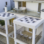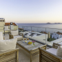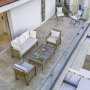 At the top of the stairs is a glass door providing access to the roof terrace which is furnished with a cozy wood and cushioned sofa set, together with two metal armchairs with cushions, so plenty of seating for everyone to enjoy a sun downer before heading off into town.
