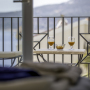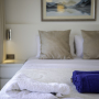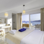 The next bedroom is a double with an en-suite shower room. Within the room is a wardrobe and dressing table with stool. Sliding doors lead out to a private covered balcony with two chairs and a side table offering wonderful sea views across the bay.