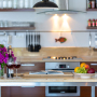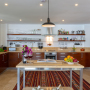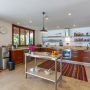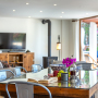 The modern kitchen area is well-equipped and includes a range of appliances such as large fridge-freezer, oven, hob and extractor, water cooler, dishwasher, washing machine and microwave.