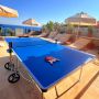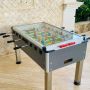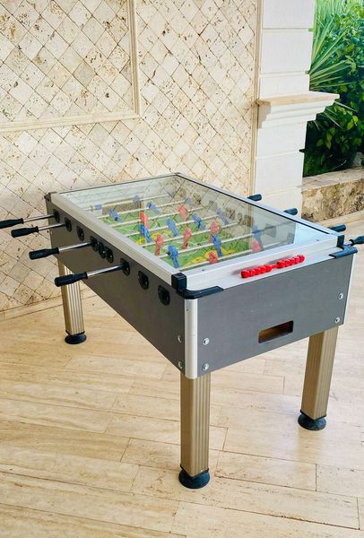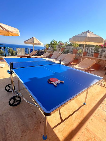 There is a high-quality table tennis setup (including all the necessary equipment) as well as a football table.