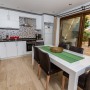 Open plan well-equipped kitchen with modern appliances including dishwasher, fridge-freezer, cooker and hob. There is a dining table to seat 8. The spacious lounge area provides comfortable seating and a wall-mounted satellite TV + DVD player.
