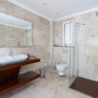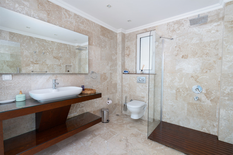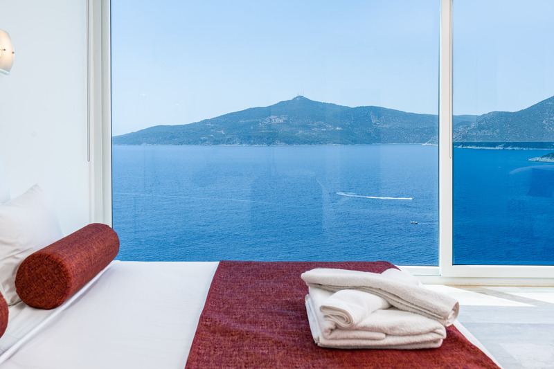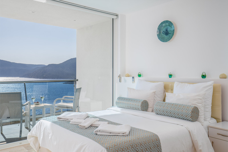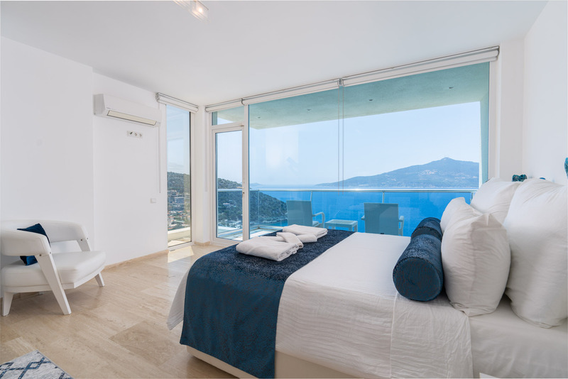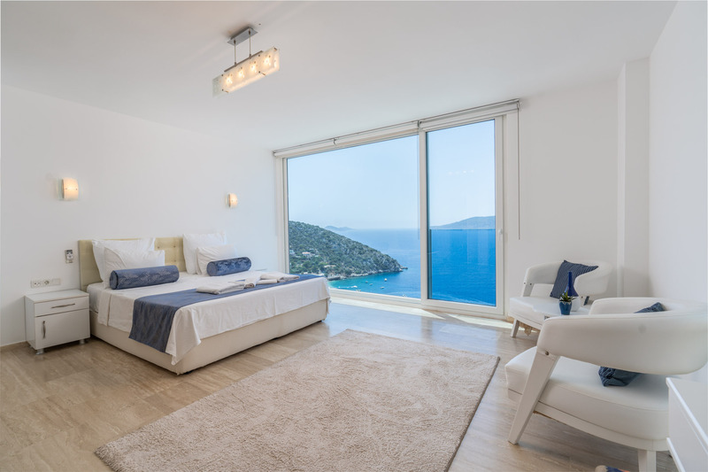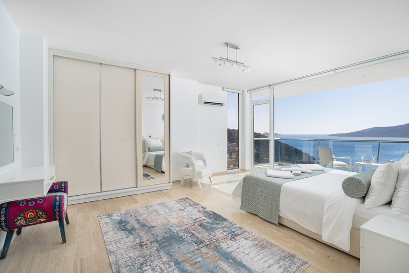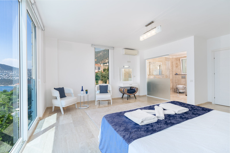The first and second floors are identical. Each floor comprises of two double bedrooms, each with an ensuite shower / wet room, built-in wardrobes and vanity unit. All bedrooms have floor to ceiling windows with fabulous views across Kalkan Bay and the Mediterranean. One bedroom has a large balcony with seating and the other room a Juliet balcony.