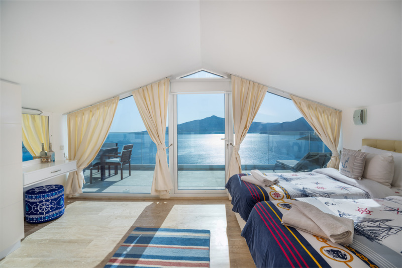 On the upper floor is the fifth, attic style bedroom with 2 single beds, an en-suite shower / wet room, built-in wardrobe and vanity unit. There is direct access to a large roof terrace with 360 degree views of Kalkan Bay and the Taurus Mountains behind.