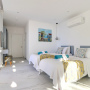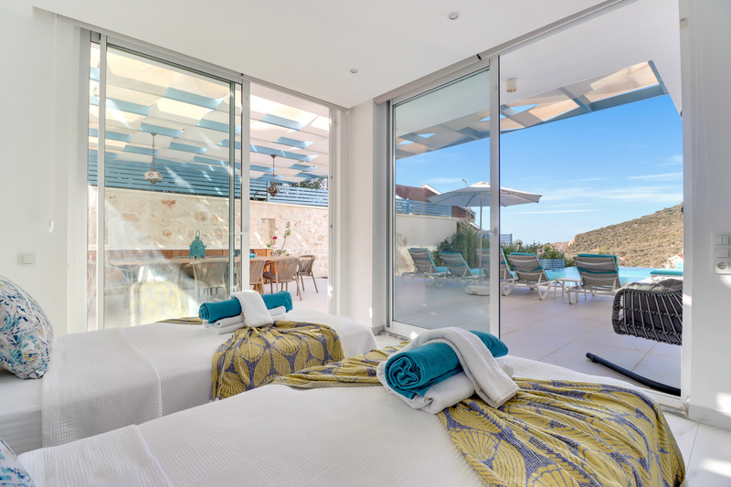 This space is accessed through sliding doors, or via the side door on the steps leading up to the pool terrace and main entrance door. This bedroom can be configured as a twin or a double and has an en-suite shower room as well as sofa set and kitchenette. Please note that as this bedroom is separately-accessed from the main part of the house, it’s not suitable for unaccompanied young children.