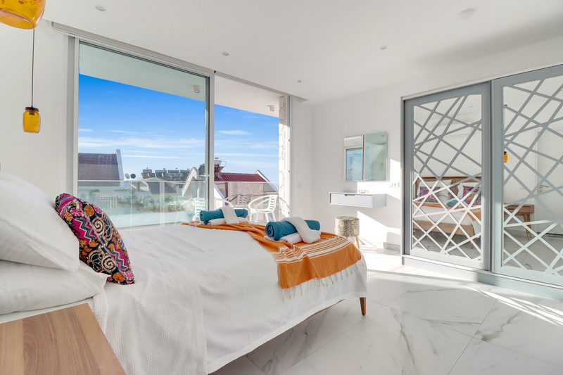This floor is dedicated to three very spacious bedrooms. The first double room has an en-suite shower room with built in wardrobe and dressing table with stool. Sliding doors provide access to a shared wrap-around balcony. This is furnished with two chairs and a table from which to enjoy the sea and mountain views.