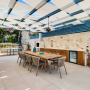 There is a dining table with 10 chairs beneath a pergola for al-fresco dining and a stone-built BBQ is also provided with a preparation area and sink.