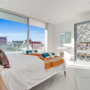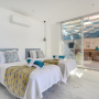 The middle room is a double with en-suite shower room and sliding doors to access the shared balcony. There is a built-in wardrobe and dressing table with stool.