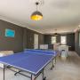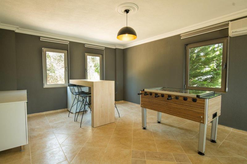 Upon entering, you will find a games room to the left with table tennis, table football and a dart board, as well as a bar area with fridge and a chaise longue.