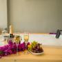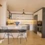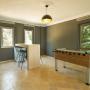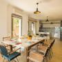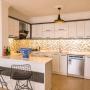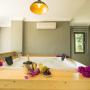 The well-equipped modern kitchen has a breakfast bar and 2 stools, fridge-freezer, dishwasher, microwave, gas hob, oven, sandwich maker, kettle, toaster and water cooler. There is also a dining area on this level with seating for 8 guests.