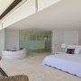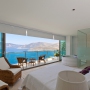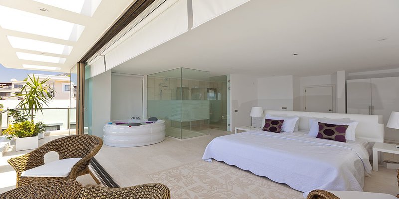The extremely spacious master bedroom extends across the whole width of the first floor. This bedroom has a super-king sized bed, with an open-plan Jacuzzi bath overlooking the sea plus a partially screened wet room. The main feature of the master bedroom is the huge balcony which extends the entire width of the house. This is furnished with comfortable seating, plus a day bed from which to enjoy the beautiful views.