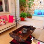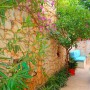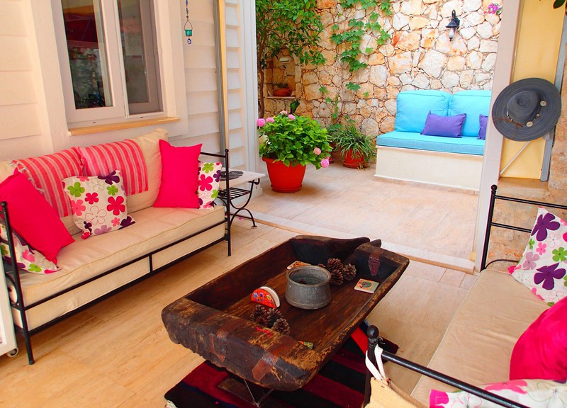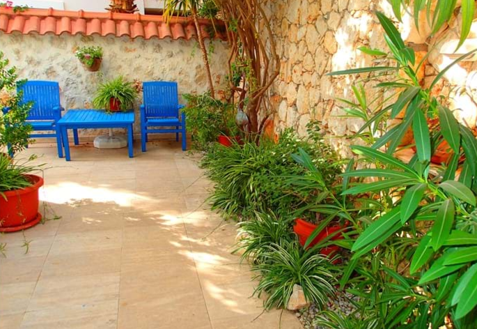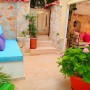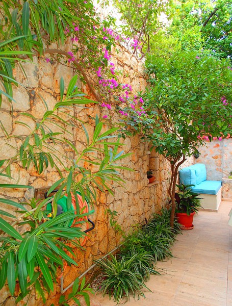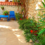 At the rear of the villa is a cushioned built-in sofa and on the other side of the mature garden are two wooden chairs and a table from which to enjoy the beautiful garden and fruit trees on the terraces above.