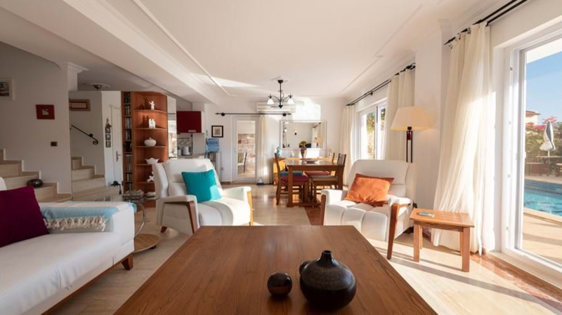 The villa is traditionally furnished and offers different areas for a family or group of friends to relax together or find a quiet corner to sit while taking in the views of the mountains and the sea.