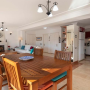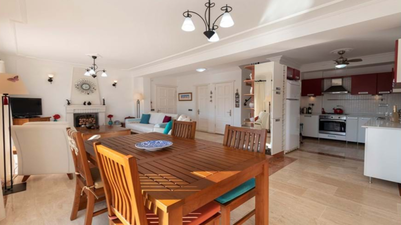 The living room has a sofa and two armchairs spaced around a coffee table plus an ornamental fireplace. There is also a Smart TV and sliding doors lead out to the pool terrace. The dining table seats 4 comfortably and nearby is a second set of sliding doors leading out to the pool terrace.