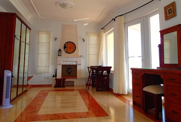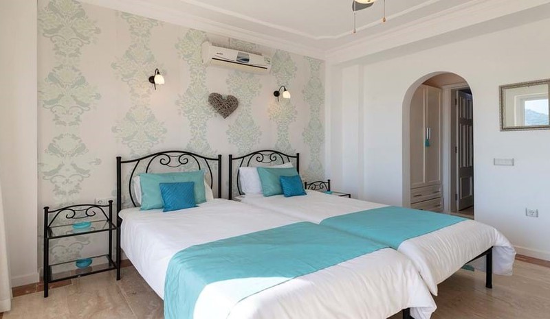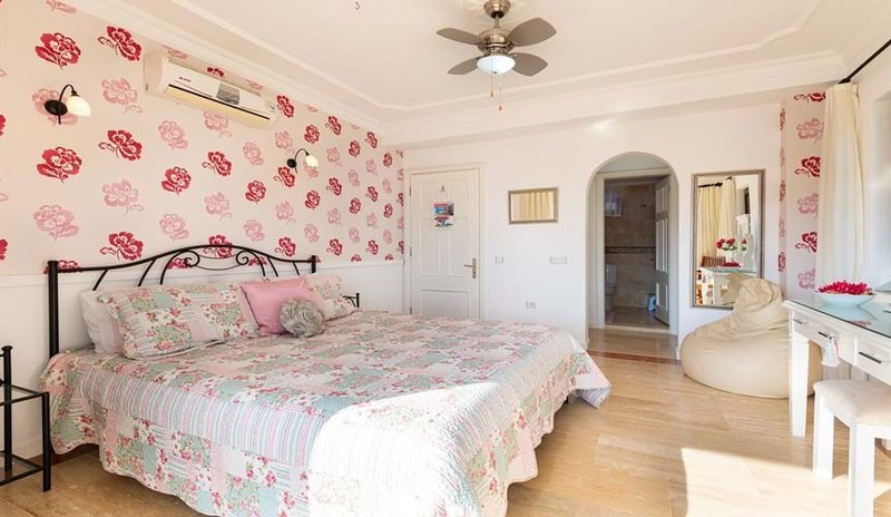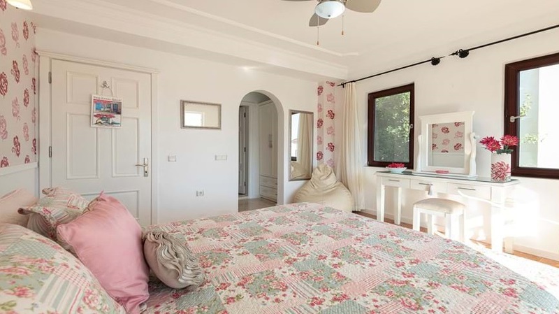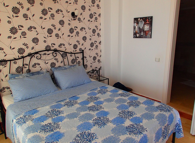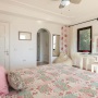 There are two bedrooms on this level - the pink room is a double with a feature wall and a dressing area with fitted wardrobes. An archway leads through to the en-suite bathroom with an over-bath shower. Within the bedroom is a dressing table with stool and sliding doors lead out to the shared balcony with two wrought iron armchairs with cushions plus a circular table with two chairs in which to take in the views across Kalamar Bay.