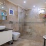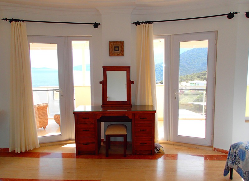 This floor has the Master bedroom that occupies the whole of the front of the villa on this level. Within the room is a feature wall with a chaise longue at the end of the double bed. There are unique wooden wardrobes with mirrored doors and a dressing table with stool. There is also an office table with a chair plus an en-suite shower room. On either side of the dressing table are two glass doors giving access to the covered private balcony. On the balcony are two wicker armchairs and a coffee table from which to take in the wonderful sea views.