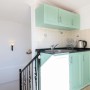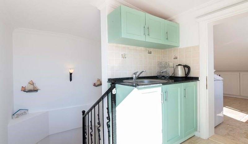 At the top of the stairs is a kitchenette with sink, kettle and drinks’ fridge with glasses and cups.