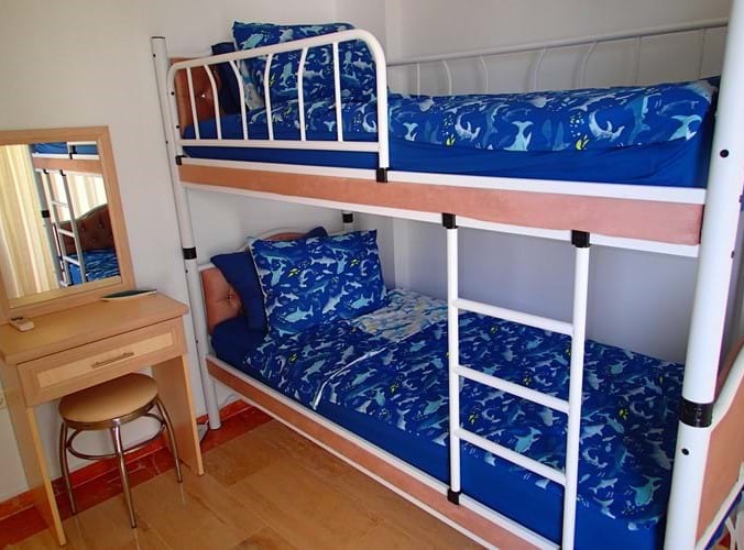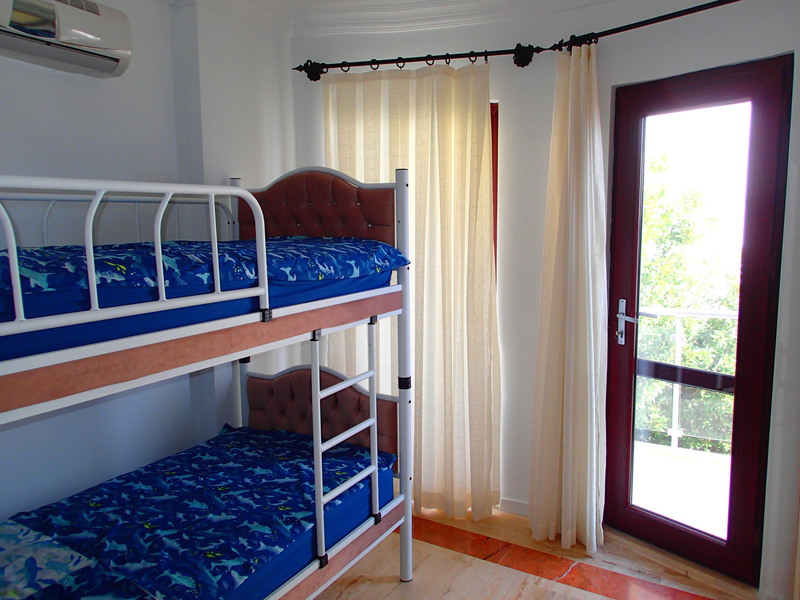 Also on this floor is also a small bedroom with two bunk beds, a dressing table with stool and a wardrobe. A glass door leads to a side balcony with a chair and small table. This room would be ideal for children who would need to share the en-suite shower room within the Master bedroom.