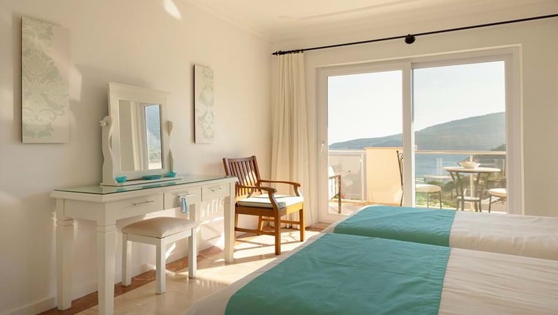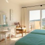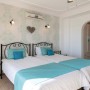Next door is the blue room with a feature wall and this room has twin beds with an arch leading to a built in wardrobe and an en-suite shower room. Within the bedroom is a dressing table with stool and sliding doors lead out to the shared balcony with sea views.