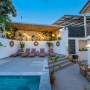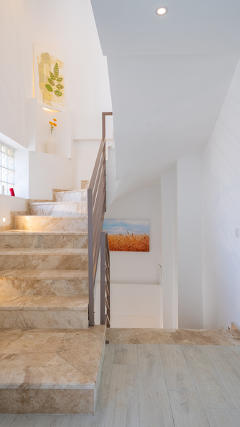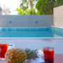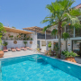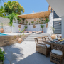 The villa has a beautiful marble clad pool with integral steps for access. The pool terrace is accessed up 4 steps leading to a covered area with 6 sun loungers. The lower garden has a seating set and outside shower.