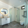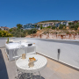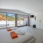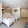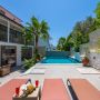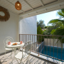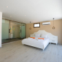 Beneath high eaves, the master bedroom has a double bed, dressing table, wardrobe and wall mounted TV plus an en-suite shower room. Sliding doors give access to the villa's roof terrace which has a Jacuzzi bathtub and two chairs with a side table. From this level, views of the mountains behind the villa can be enjoyed.