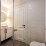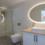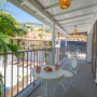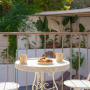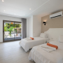 The second bedroom is a spacious twin room with dressing table, wardrobe and wall mounted TV plus an en-suite shower room. Sliding doors lead to the shared covered balcony which is furnished with two chairs and a small side table.