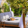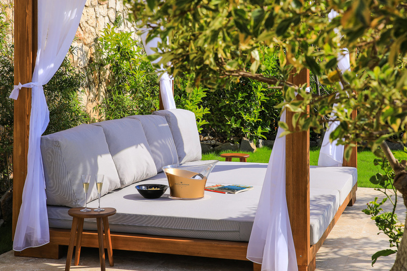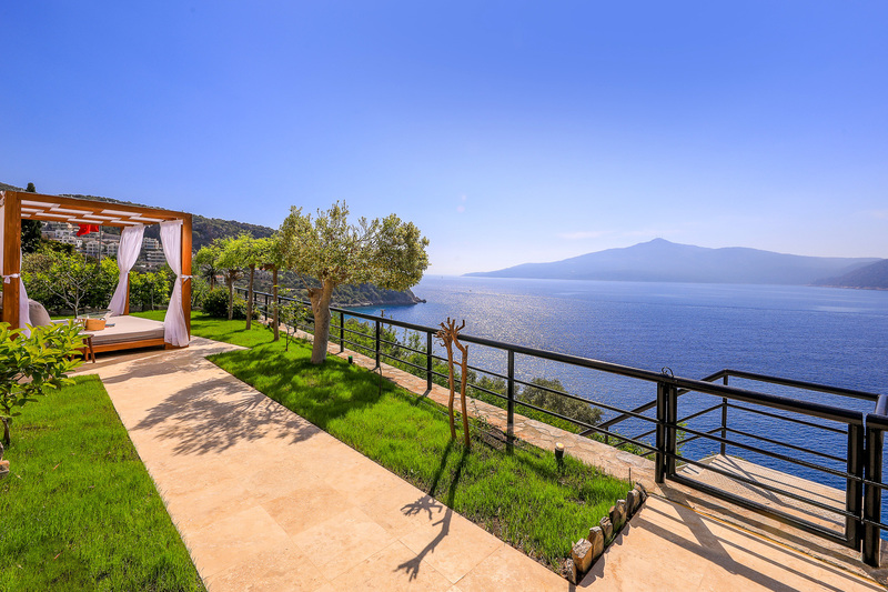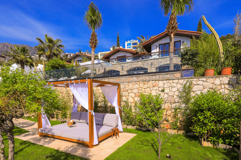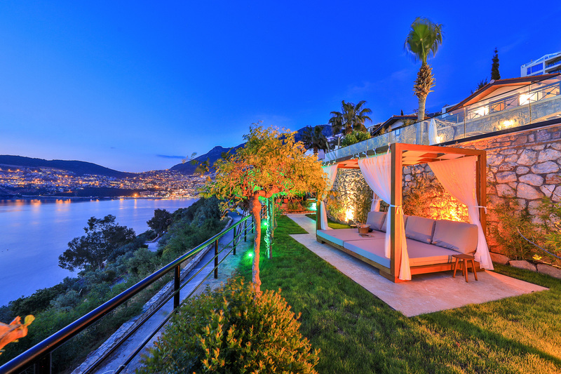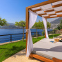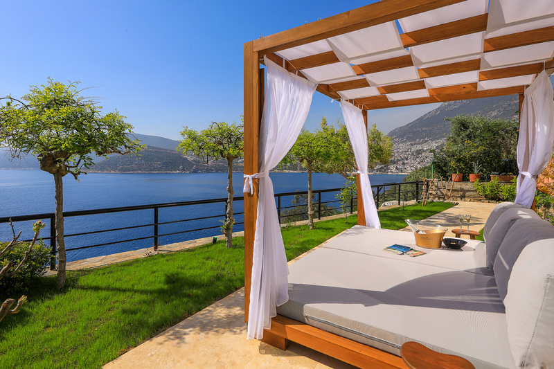 Lower garden – lawned area, with cabana-style double lounger overlooking Kalkan bay.